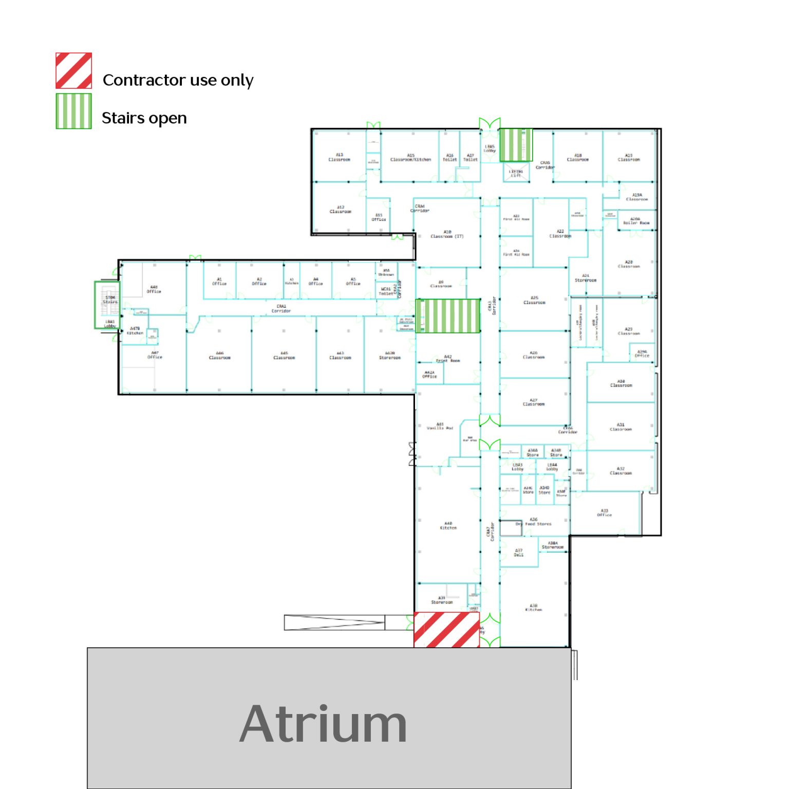 - The stairs closest to the atrium will be strictly reserved for contractor use only throughout the clear‑down period (see plan). Staff and learners must not use this stairwell at any time except on Tuesday 16 December, when no contractors will be on site due to the cross‑College taster day.
